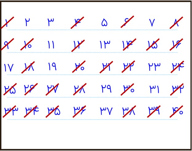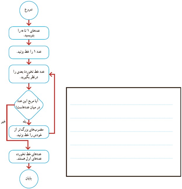 نتایج فعّالیت قبل، که به آن روش غربال می گویند در نمودار زیر خلاصه شده است. این نمودار را برای n=40 دنبال کنید و همهٔ مرحله ها را یک به یک انجام دهید. هر مرحله از نمودار را برای خود توضیح دهید؛ برای مثال، جملهٔ «عددهای 1 تا n را بنویسید» را بخوانید و عددهای 1 تا 40 را در کادر زیر بنویسید. عدد 1 را خط بزنید. عدد خط نخوردهٔ بعدی را، که عدد ٢ است در نظر بگیرید. آیا مربع عدد ٢ بین عددها هست؟ مضرب های مرکب آن را خط بزنید. دوباره به مرحلهٔ قبلی برگردید و به همین ترتیب کار را ادامه دهید.