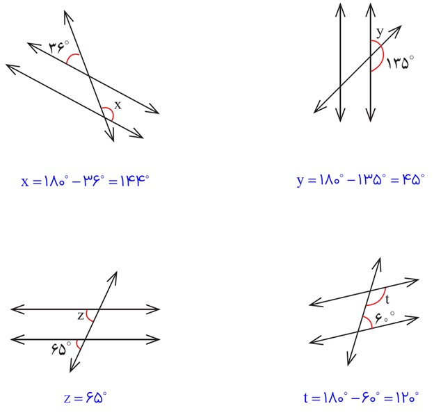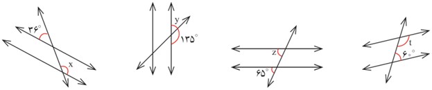 1 در هر شکل یک خط مورب، دو خط موازی را قطع کرده است. اندازه زاویه های مجهول را به دست آورید.