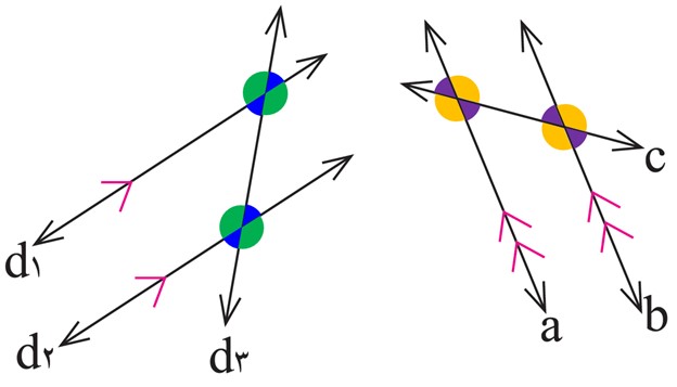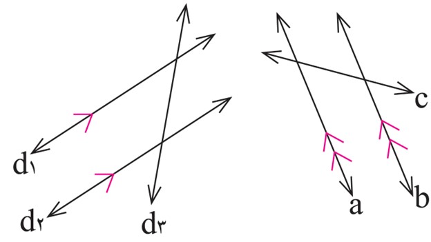 2 موازی بودن دو خط را مانند شکل با علامت گذاری آنها مشخص می کنیم. عبارت «خط d1 با خط d3 موازی نیست» را به صورت \({d_1}\not \parallel {d_3}\) می نویسیم.