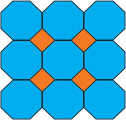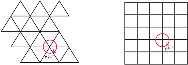 4 کاشی هایی به شکل چندضلعی های منتظم داریم و می خواهیم سطحی را فقط با یک نوع از آنها کاشی کاری کنیم. شکل های زیر نشان می دهند که با سه ضلعی و چهارضلعی منتظم (یعنی مثلث متساوی الاضلاع و مربع) می توان کاشی کاری کرد.