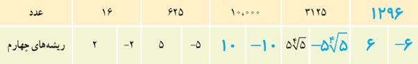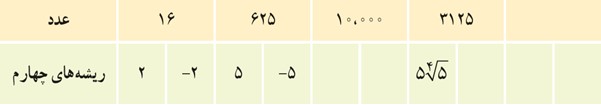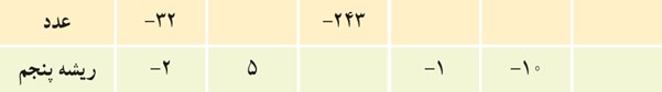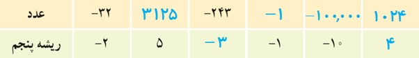 هر عدد مثبت یا منفی دارای ......... ریشهٔ پنجم است. اگر عدد مثبت باشد، ریشهٔ پنجم آن مثبت و اگر عدد منفی باشد ریشهٔ پنجم آن ......... است.