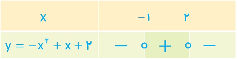 1 چندجمله ای \(y = - {x^2} + x + 2\) را با محاسبهٔ ریشه ها، در یک جدول تعیین علامت کنید؛ سپس با رسم آن، صحت علامت های به دست آمده در جدول را با نمودار، بررسی کنید.