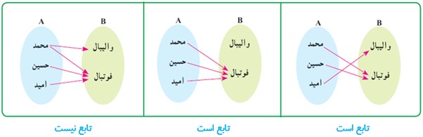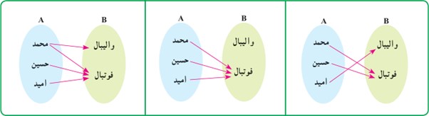 1 مجموعهٔ A شامل سه دانش آموز به نام های محمد، حسین و امید و مجموعهٔ B شامل دو رشتهٔ ورزشی است که دانش آموزان می توانند انتخاب کنند. کدام یک از نمودارهای پیکانی داده شده تابع است و کدام یک تابع نیست؟