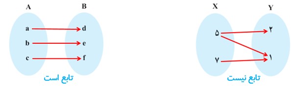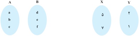 2 از مجموعۀ A به مجموعۀ B نمودار پیکانی را طوری رسم کنید که یک تابع را نمایش دهد. از مجموعهٔ X به مجموعۀ Y این کار را به گونه ای انجام دهید که حاصل یک تابع نباشد. پاسخ خود را با پاسخ دوستانتان مقایسه کنید.