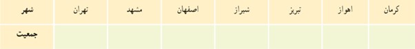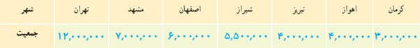 1 نام شهرهای تهران، مشهد، اصفهان، شیراز، تبریز، اهواز و کرمان در یک سطر جدول زیر نوشته شده اند. در سطر دیگر، جمعیت آن شهرها را به طور تقریبی بنویسید (جمعیت دقیق لازم نیست).