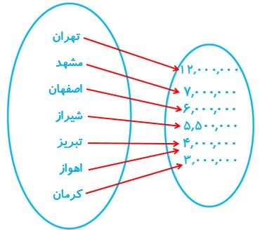 رابطهٔ بالا را به صورت پیکانی و زوج مرتب نمایش دهید. آیا این رابطه یک تابع است؟