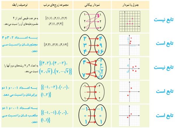 2 در هر سطر جدول زیر نمایش های مختلف یک رابطه داده شده است. جاهای خالی جدول را کامل و معلوم کنید که آیا این رابطه یک تابع است؟ ردیف آخر را به دلخواه خودتان کامل کنید.