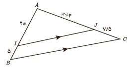 \(\begin{array}{*{20}{l}}\begin{array}{l}\frac{{AI}}{{IB}} = \frac{{AJ}}{{JC}} \Rightarrow \frac{{2x}}{5} = \frac{{x + 4}}{{7/5}}\\\\ \Rightarrow 15x = 5x + 20 \Rightarrow 10x = 20 \Rightarrow x = 2\\\end{array}\\\begin{array}{l}AI = 2x = 4\\\end{array}\\{AJ = x + 4 = 6}\end{array}\)