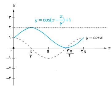 شکل زیر نمودار تابع با ضابطهٔ y=3cosx را نشان می دهد. به طور مشابه هر یک از توابع با ضابطه های داده شده را در بازهٔ \([0,2π]\)، با استفاده از نمودار تابع کسینوس رسم کنید.
