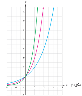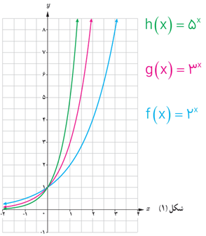1 نمودارهای سه تابع \(h(x) = {5^x}\,,\,g(x) = {3^x}\,,\,f(x) = {2^x}\) در شکل (1) رسم شده اند. ضابطه هر تابع را روی نمودار آن بنویسید.