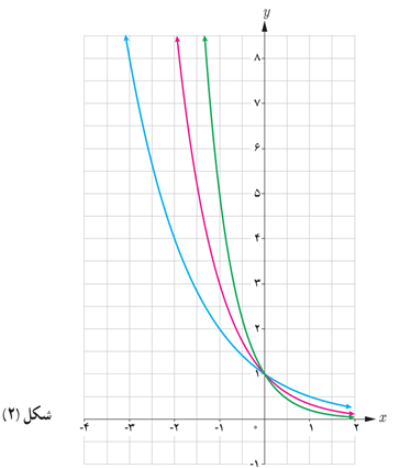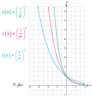 4 نمودارهای توابع \(v\left( x \right) = {\left( {\frac{1}{3}} \right)^x}\;,\;u\left( x \right) = {\left( {\frac{1}{2}} \right)^x}\) و \(t\left( x \right) = {\left( {\frac{1}{5}} \right)^x}\) در شکل (2) رسم شده اند. ابتدا ضابطه هر یک را روی نمودار آن بنویسید و سپس دامنه و برد آنها را به دست آورید. آیا این توابع یک به یک هستند؟