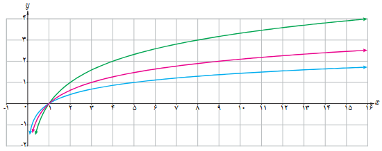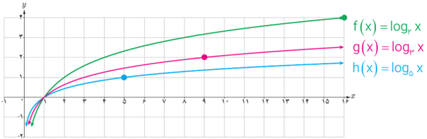 1 الف نمودار سه تابع \(h\left( x \right) = {\log _5}x\;\;,\;\;g\left( x \right) = {\log _3}x\;\;,\;\;f\left( x \right) = {\log _2}x\) در شکل زیر رسم شده اند. ضابطه هریک را روی نمودار آن بنویسید.
