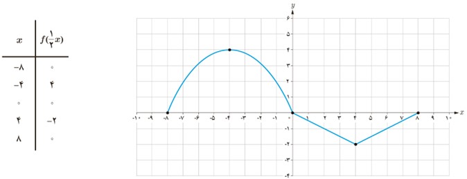 پس دامنهٔ تابع\(y = f(\frac{1}{2}x)\) بازهٔ \(\left[ { - 8\,,\,8} \right]\) است و نقاط متناظر به صورت زیر است:
