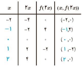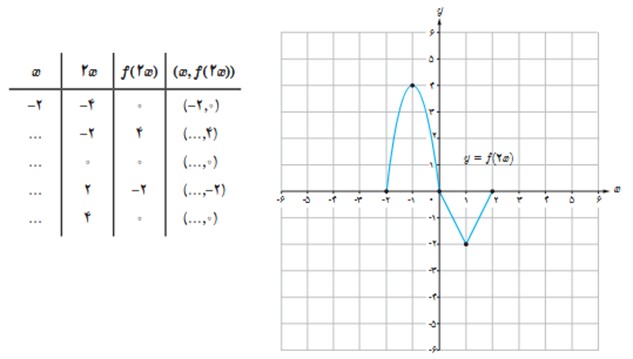بنابراین دامنهٔ تابع y=f(2x) بازۀ \([-2,2]\) است. جدول نقاط را کامل کنید.