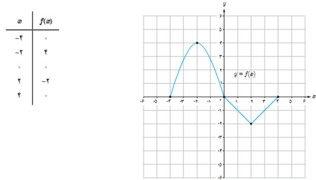 نمودار تابع f با دامنۀ \([-4,4]\) به صورت زیر داده شده است، می خواهیم با استفاده از آن نمودار توابع \(y=f(2x)\) و \(y = f\left( {\frac{1}{2}x} \right)\) را رسم کنید.