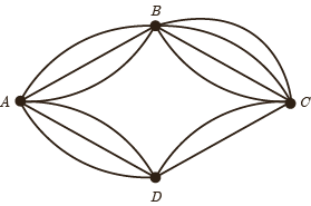 مطابق شکل زیر، میان چهار شهر A ، B ، C و D راه هایی وجود دارد؛ مشخص کنید که به چند طریق می توان: