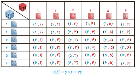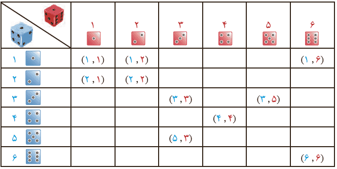 1 برای تعیین فضای نمونهٔ پرتاب دو تاس آبی و قرمز، جدول زیر را کامل کنید. سپس به کمک اصل ضرب، درستی تعداد کل حالات موجود در جدول را بررسی کنید.