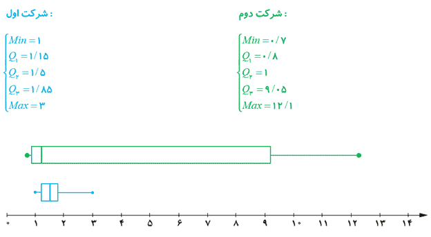الف با استفاده از داده های جدول بالا، نمودار جعبه ای حقوق ماهیانهٔ کارمندان این دو شرکت را روی یک محور رسم کنید.