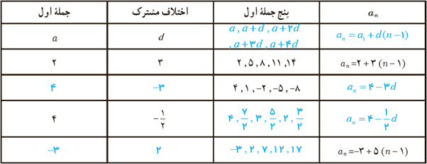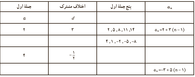 1 ضابطهٔ بازگشتی دنبالهٔ حسابی با جملهٔ اول a1 و اختلاف مشترک d را مشخص کنید.