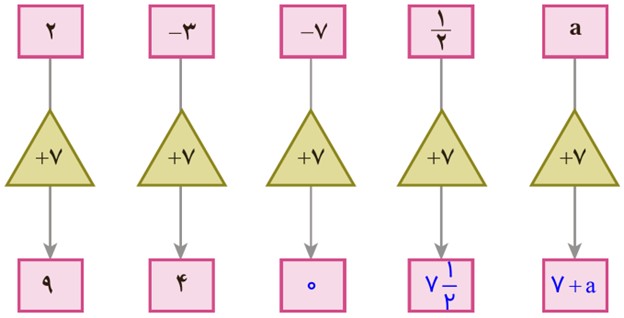 در نمودار رو به رو، به هر عدد از ردیف اول، 7 واحد افزوده شده و نتیجه در ردیف سوم نوشته می شود: