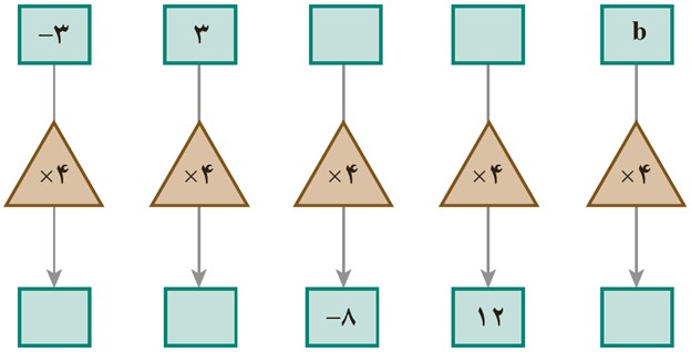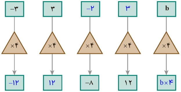 در نمودار رو به رو، به هر عدد از ردیف اول، در عدد 4 ضرب می شود و نتیجه در ردیف سوم نوشته می شود: