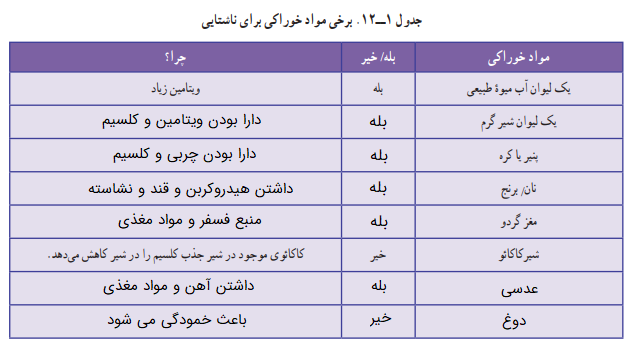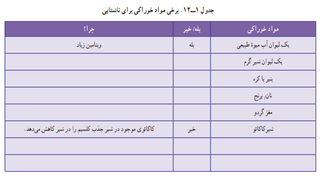 با هماندیشی درباره ویژگی های منطقه، عادتهای خود و مانند این موارد، خوراکی را که برای ناشتایی مناسب یا نامناسب میدانید، در جدول 1ــ12 مشخص کنید و دلیل آن را بنویسید.