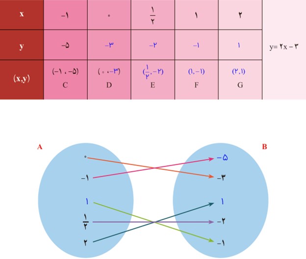 با توجّه به رابطهٔ خطی y=2x-3، اگر فرض کنیم، xها یا متغیرهای مستقل اعضای مجموعهٔ \(A = \left\{ {0\,,\,1\,,\, - 1\,,\,\frac{1}{2}\,,\,2} \right\}\) باشند. ابتدا جدول مربوط به این رابطه را مشابه جدول قبل، تشکیل می دهیم و سپس نمودار پیکانی آن را رسم می کنیم. (جاهای خالی را پر کنید.)