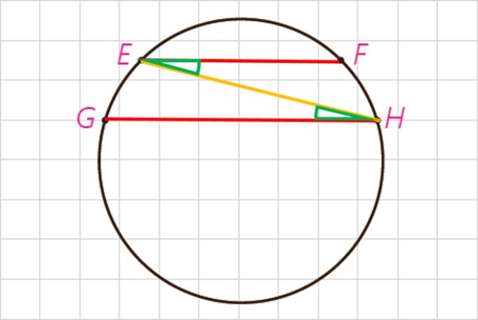 \(\mathop {EG}\limits^\frown = \mathop {FH}\limits^\frown \Rightarrow \frac{{\mathop {EG}\limits^\frown }}{2} = \frac{{\mathop {FH}\limits^\frown }}{2}\)