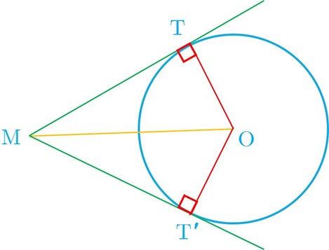 هرگاه از نقطه M خارج دایره C(O,R) دو مماس بر دایره رسم کنیم و T و T’ نقاط تماس باشند، ثابت کنید: