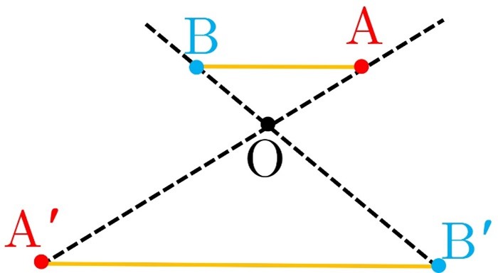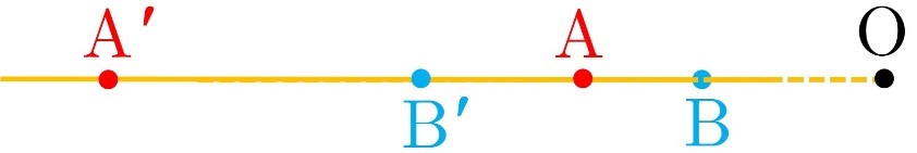 \(\begin{array}{l}A'B' = OA' - OB'\;\;\;\mathop \Rightarrow \limits_{OB' = k.OB}^{OA' = k.OA} \\\\A'B' = k.OA - k.OB = k\left( {OA - OB} \right) = k.AB\\\\ \Rightarrow A'B' = k.AB \Rightarrow \frac{{A'B'}}{{AB}} = k\end{array}\)
