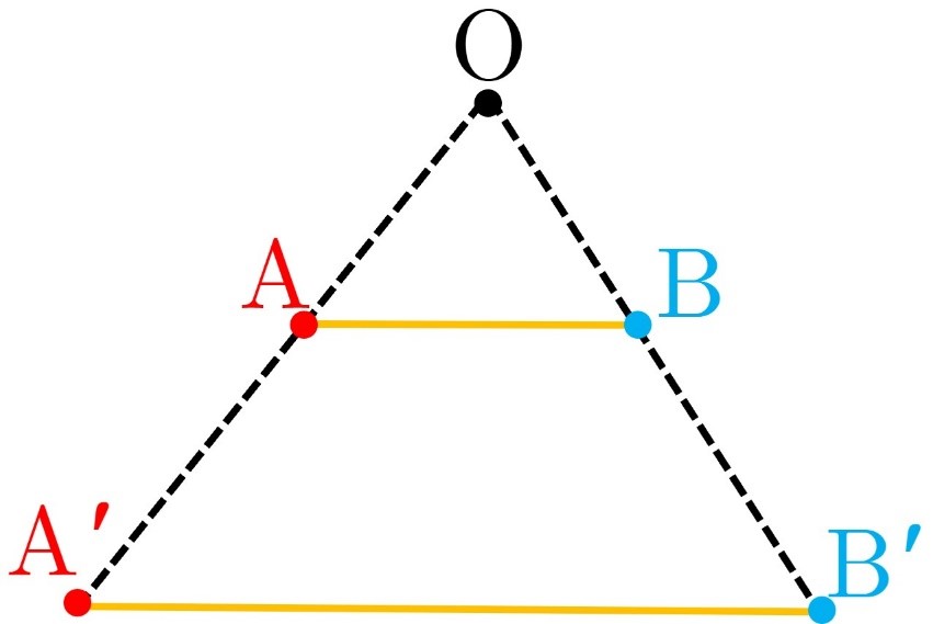 \(\left. \begin{array}{l}OA' = k.OA\\OB' = k.OB\end{array} \right\} \Rightarrow \frac{{OA'}}{{OA}} = \frac{{OB'}}{{OB}} = k \to AB\parallel A'B' \to \frac{{OA'}}{{OA}} = \frac{{OB'}}{{OB}} = \frac{{A'B'}}{{AB}} = k\)