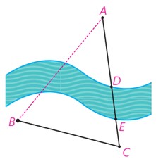 می خواهیم روی یک رودخانه عمیق بین دو نقطه A و B در دو طرف رودخانه، پلی بنا کنیم. برای محاسبات مربوط به احداث پل، باید فاصله ابتدا و انتهای آن (یعنی طول AB) را به دست بیاوریم؛ اما امکان اندازه گیری مستقیم (به دلیل وجود رودخانه) وجود ندارد. برای این کار از نقطه A در جهتی حرکت می کنیم تا با عبور از قسمت کم عمق رودخانه (DE) به نقطه C برسیم و طول BC را اندازه گیری می کنیم؛ سپس با زاویه یاب (تئودولیت) زاویه دید AC از نقطه B و زاویه دید AB از C را اندازه می گیریم. به صورت زیر نشان دهید با داشتن طول BC و زوایای B و C می توان فاصله AB را به دست آورد: