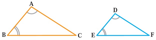 1 در دو مثلث داده شده زوایای برابر در شکل مشخص شده است. ثابت کنید زاویه های سوم از دو مثلث نیز با هم برابر است.