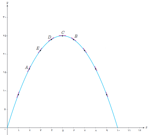 ب دو نقطه روی منحنی مشخص کنید که مقدار مشتق تابع در آنها قرینه یکدیگر باشد.