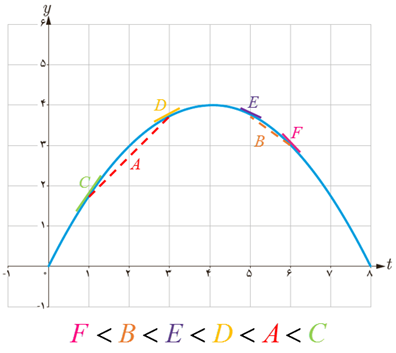 نمودار زیر موقعیت یک ذره را در لحظه t نمایش می دهد. مقادیر زیر را از کوچک به بزرگ مرتب کنید: (محاسبۀ عددی لازم نیست.)