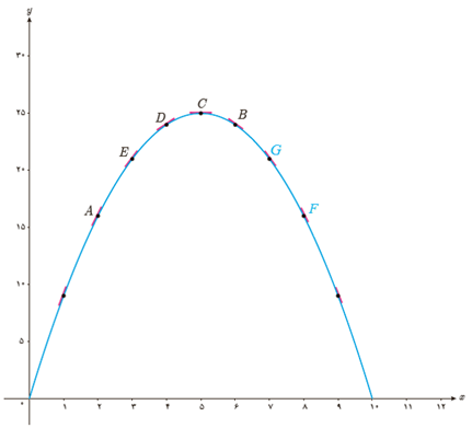 ب دو نقطه روی منحنی مشخص کنید که مقدار مشتق تابع در آنها قرینه یکدیگر باشد.