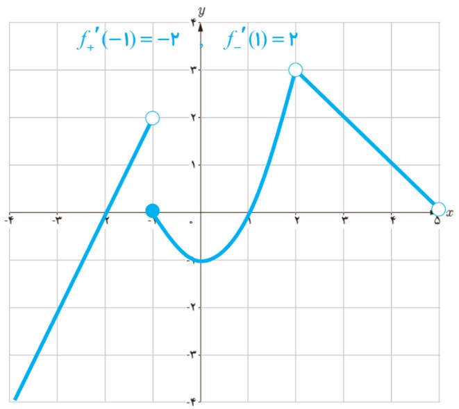 تابع در نقطۀ [2،0-] مشتق پذیر نیست؛ زیرا در فاصلۀ [2،0-] پیوسته نیست، چون تابع در x=-1 ناپیوسته و مشتق ناپذیر است.