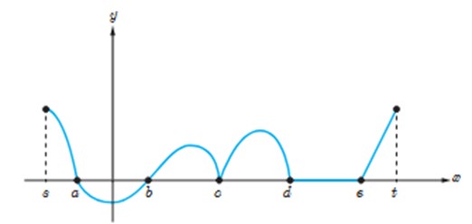 در x=a ماکزیمم نسبی دارد و نقاط x=ab,c,d,e بحرانی هستند؛ زیرا مشتق در این نقاط صفر می باشند و در x=b مینیمم نسبی