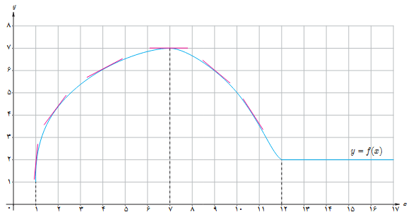 الف در بازهٔ (1,7) که f اکیداً صعودی است، شیب خط های مماس بر نمودار f، مثبت است؛ بنابراین در این بازه علامت f’ ...مثبت... است.