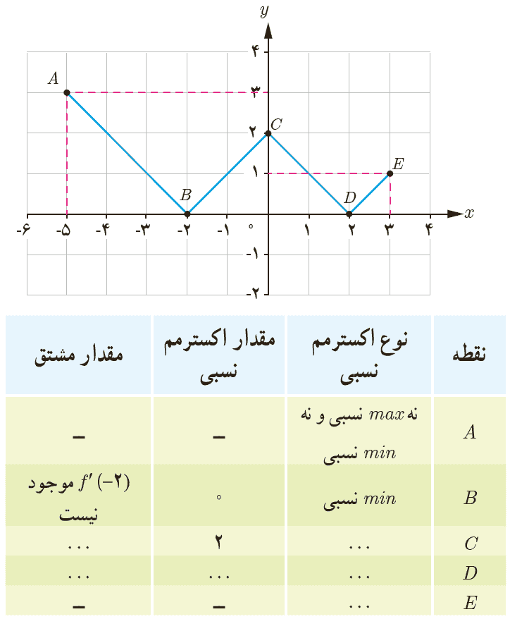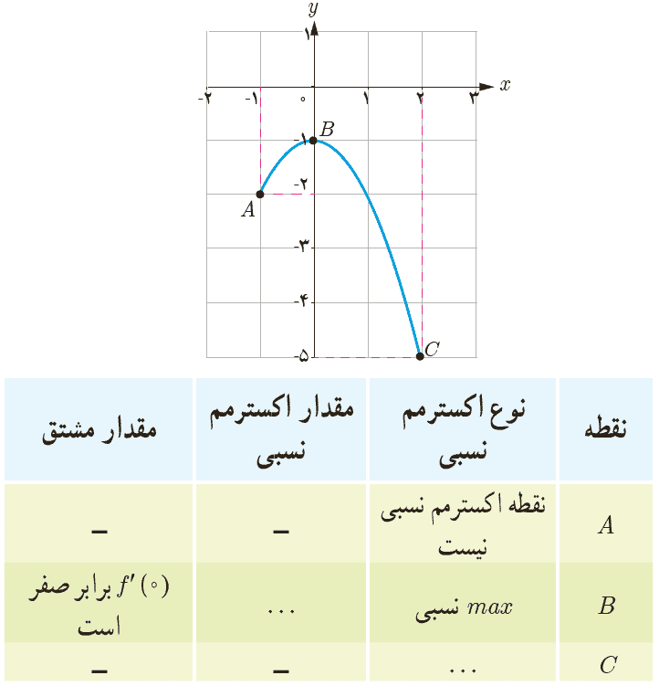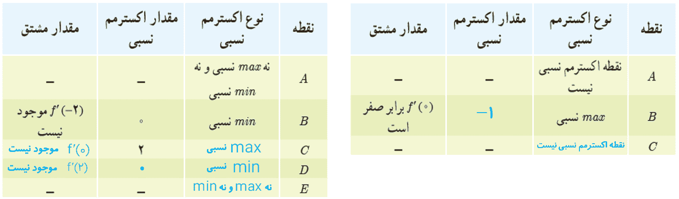 نوع اکسترمم های نسبی هر یک از توابع زیر را در نقاط مشخص شده تعیین کنید و جدول ها را کامل کنید.