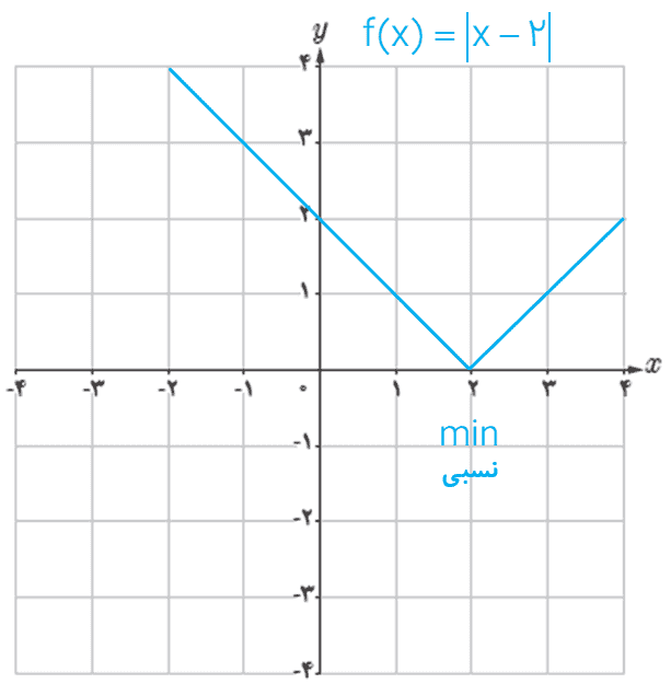 1 الف با رسم نمودار تابع f(x)=|x-2| ، نشان دهید که f در x=2 مینیمم نسبی دارد.