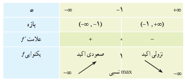 1 جدول تغییرات تابع f(x)=-x2-2x در زیر آمده است که در آن با تعیین علامت f’، بازه هایی که تابع f در آنها صعودی است و همچنین بازه هایی که نزولی می باشد، تعیین شده است. همچنین، اکسترمم نسبی تابع در جدول مشخص شده است: