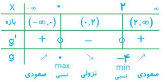 2 جدولی مشابه جدول بالا برای تابع g(x)=x3-3x2 رسم کنید که نقاط اکسترمم نسبی تابع در آن مشخص شده باشد.