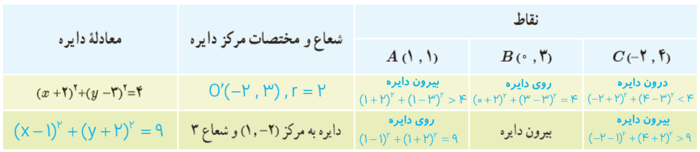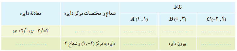 2 با تکمیل جدول، وضعیت هر نقطه را نسبت به دایره مشخص کنید: