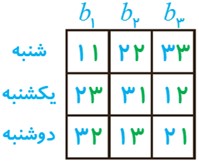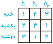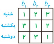 4 اگر سه برادر تقریبا هم سن و سال در خانه سه کت و سه پیراهن داشته باشند و بخواهند در سه روز اول هفته از این لباس ها به گونه ای استفاده کنند که هر فرد هر یک از کت ها و هر یک از پیراهن ها را دقیقا یکبار استفاده کرده باشد و هر کت با هر پیراهن نیز دقیقا یکبار مورد استفاده قرار بگیرد، چگونه می توانند این کار را انجام دهند؟