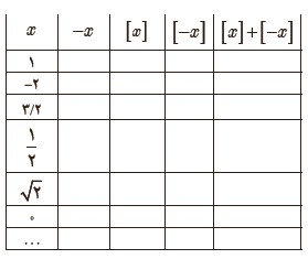 2 جاهای خالی را در جدول مقابل پرکنید و به کمک آن ضابطهٔ تابع زیر را تکمیل کنید. آیا می توان گفت تابع زیر یک تابع پله ای است؟