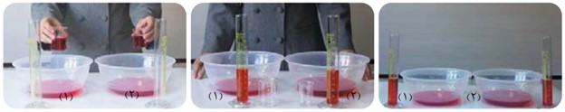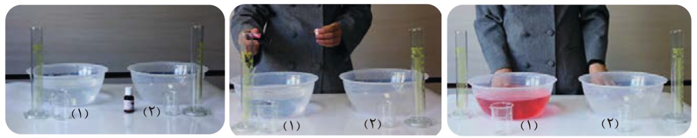ابزار، وسایل و مواد مورد نیاز: دو ظرف پلاستیکی با حجم حدود ۲ لیتر، دو بشر ۱۰۰ و ۵۰ میلی لیتری، دو استوانه مدرج ۱۰۰ میلی لیتری و حدود یک لیتر آب حاوی رنگ خوراکی.