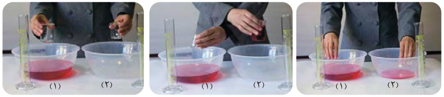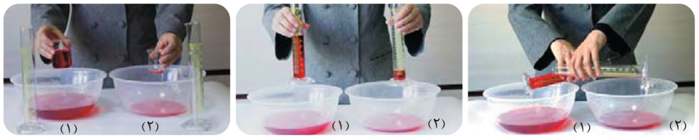 ۴ جابه جایی محتویات دو ظرف را با همین روند ادامه دهید اما پیش از اینکه هر بار به ظرف دیگر منتقل کنید نخست آنها را در دو استوانه مدرج بریزید و پس از مقایسه حجم آنها، محلولها را با استوانه مدرج جابه جا کنید (دلیل این عمل را توضیح دهید).