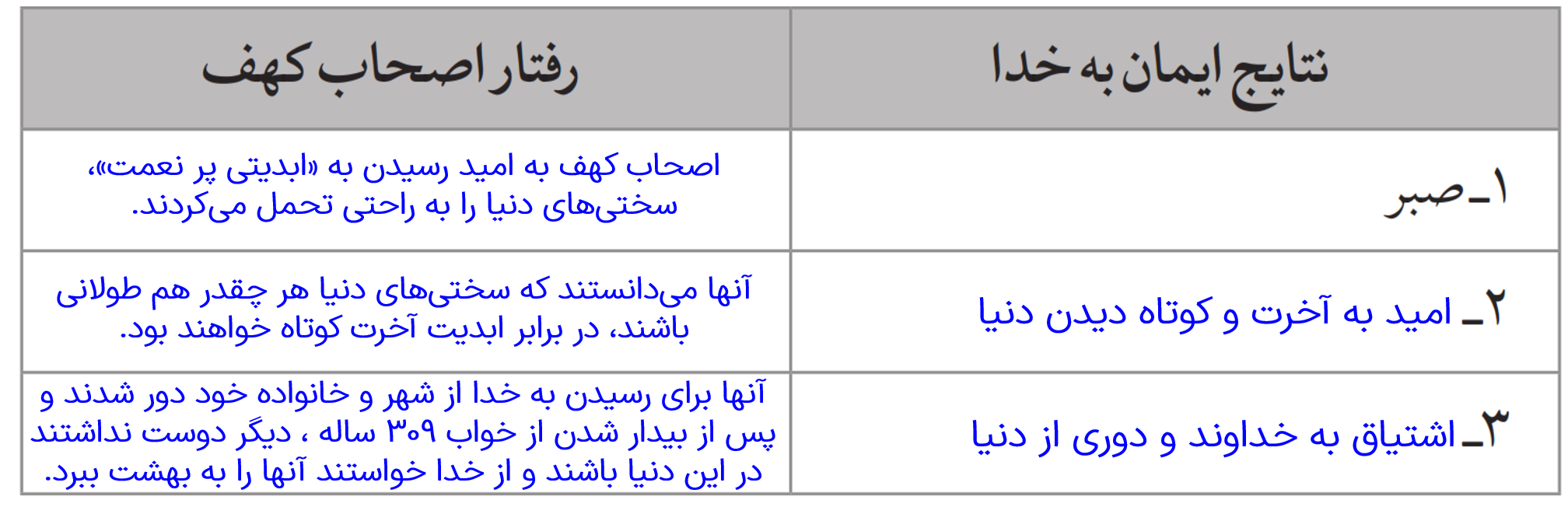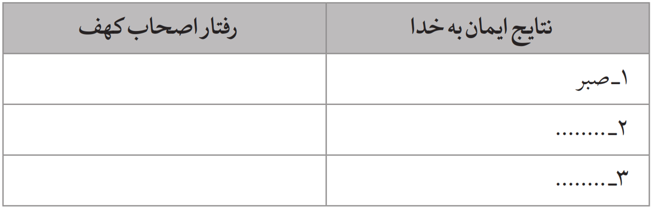 سال گذشته با نتایج ایمان به خدا آشنا شدیم. ابتدا آنها را فهرست کنید، سپس اثر هریک از آنها را در رفتار اصحاب کهف بنویسید.