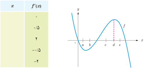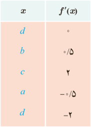 4 با در نظر گرفتن نمودار f در شکل، نقاط به طول های d، c، b، a و e را با مشتق های داده شده در جدول نظیر کنید.